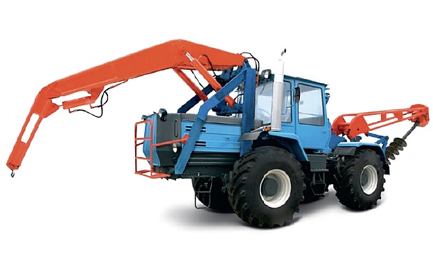 Буровой инструмент и крановое оборудование установлены на базовый колесный трактор.